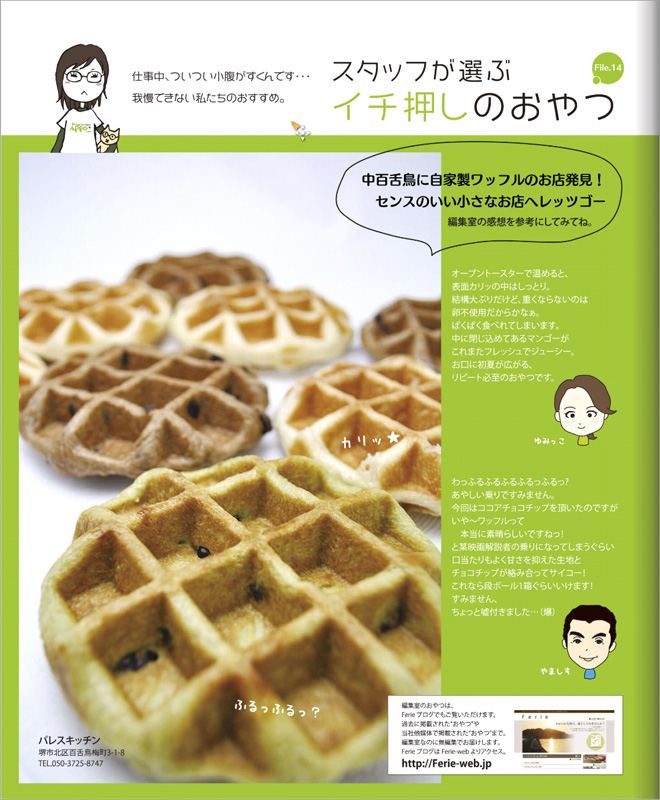 39ページの「スタッフが選ぶイチ押しのおやつ」というページにワッフルの写真と共に紹介されています。