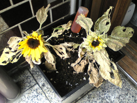 先日ここでお伝えした小さなひまわりの花ですが、定休日を挟んでお店に出勤してくると、なんと葉っぱが大変なことに!