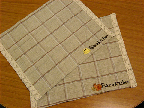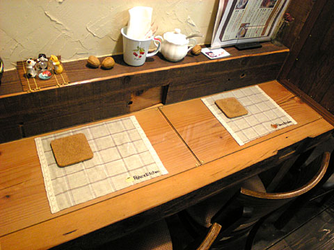 よくご来店いただいているお客様から、とてもカワイイランチョンマットを頂きました。 なんとマットに手縫いの刺繍で、リス&コーヒーカップのイラストとPalaceKitchenのロゴが入った逸品です。 とても使うのはもったいないと思いましたが、せっかくロゴ入りで作っていただけたので、店内奥のカウンター席のテーブルに敷かせていただきました。 普段なかなか座る人がいらっしゃらないカウンター席ですが、これでかなりスペシャルな席になったかな?と思います。 リオ君&リオ君のお母さん、本当にありがとうございました!(^^)